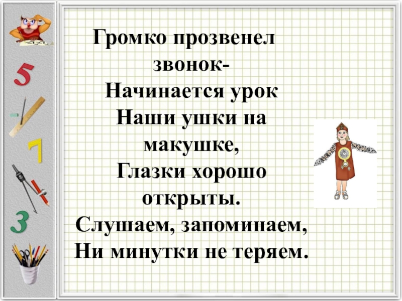 Громко прозвенел звонок- Начинается урок Наши ушки на макушке, Глазки хорошо открыты. Слушаем, запоминаем, Ни минутки не теряем.