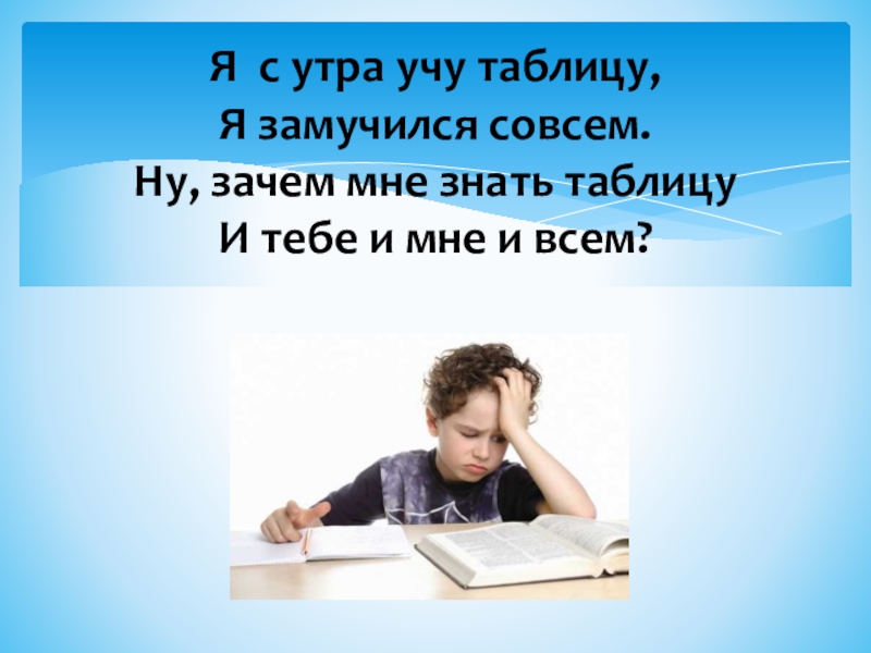 Слайд 3Я с утра учу таблицу, Я замучился совсем. Ну, зачем мне знать таблицу И