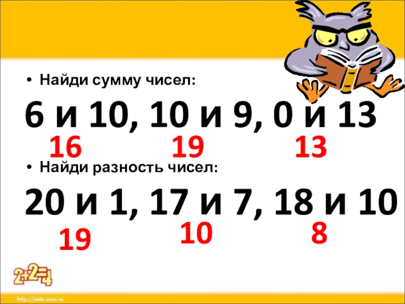 Найди сумму чисел:6 и 10, 10 и 9, 0 и 13 16 19 13Найди разность чисел:20 и