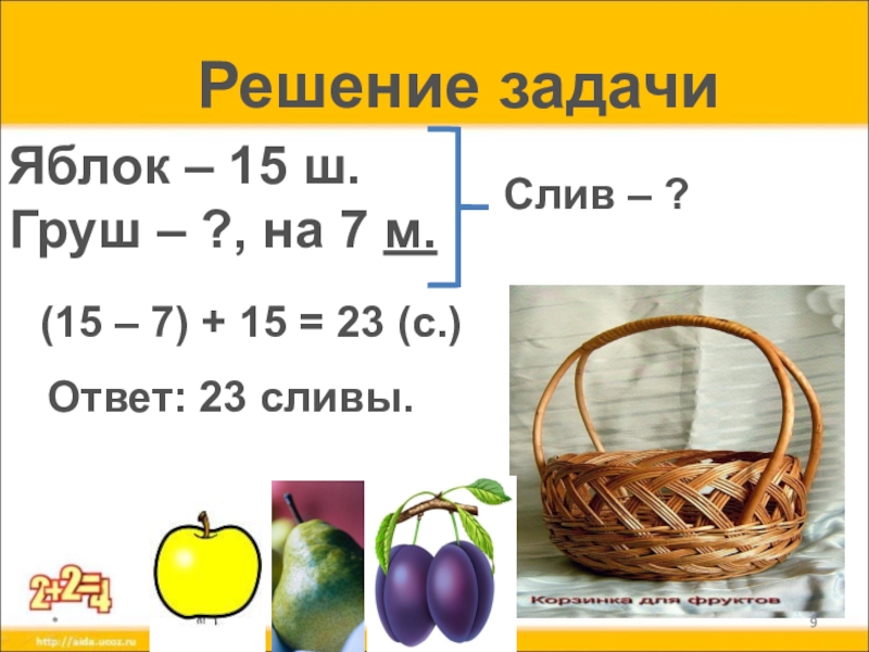 *Решение задачиЯблок – 15 ш.Груш – ?, на 7 м.  Слив – ?(15 – 7) +