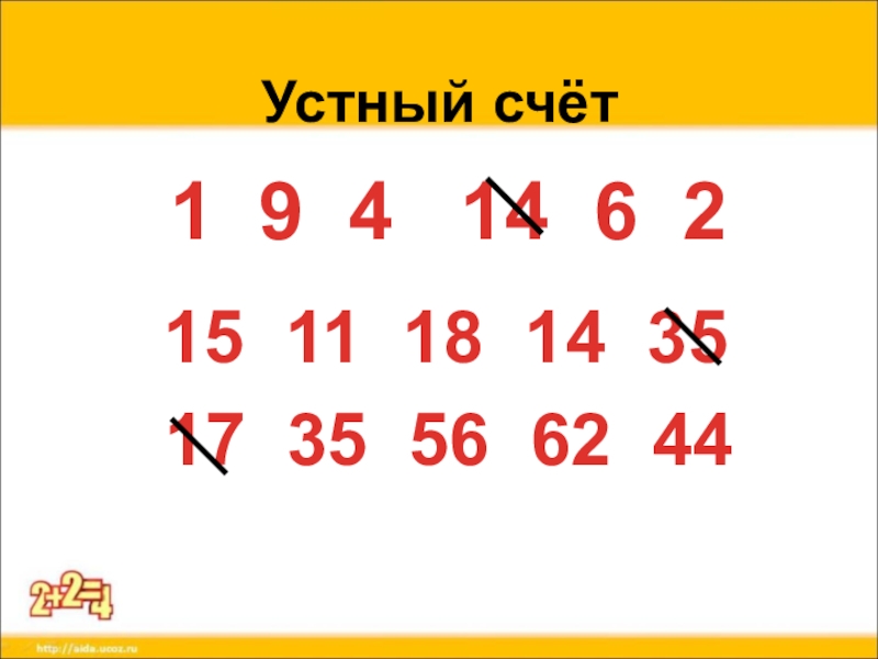 Устный счёт1 9 4  14 6 215 11 18 14 3517 35 56 62 44
