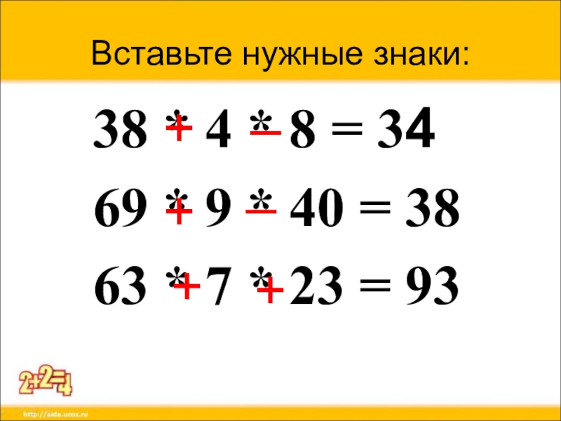 Вставьте нужные знаки:38 * 4 * 8 = 3469 * 9 * 40 = 3863 * 7