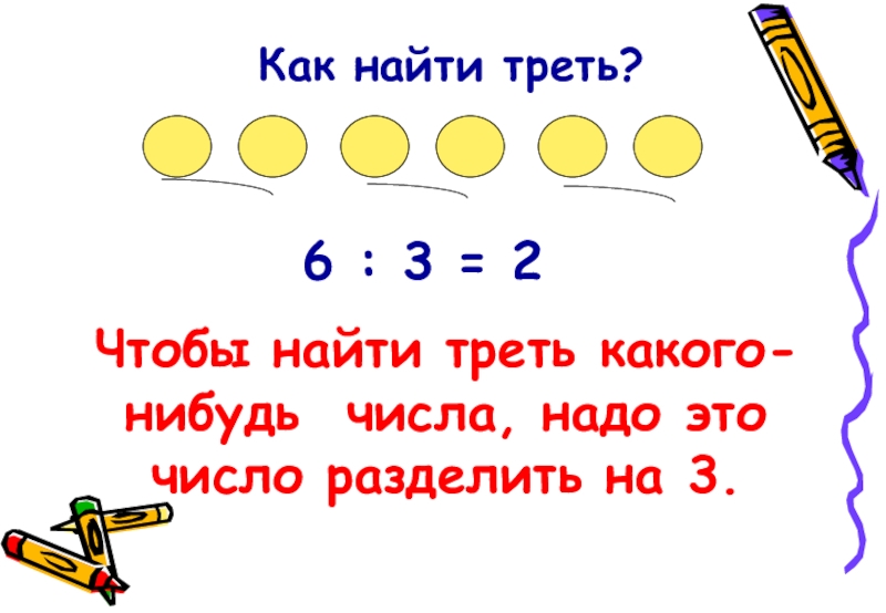 Как найти треть?6 : 3 = 2Чтобы найти треть какого-нибудь числа, надо это число разделить на 3.