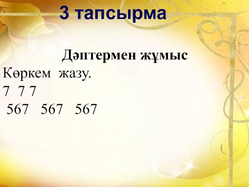 3 тапсырма  Дәптермен жұмысКөркем  жазу.7  7 7 567  567  567