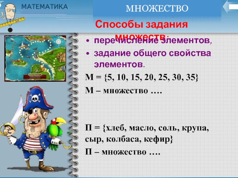 П = {хлеб, масло, соль, крупа, сыр, колбаса, кефир}