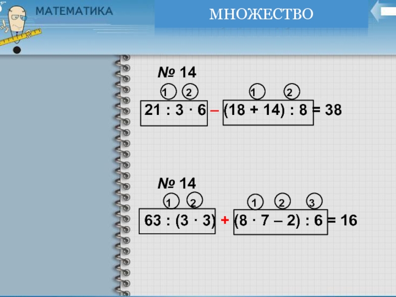 21 : 3 · 6 – (18 + 14) : 8 = 38