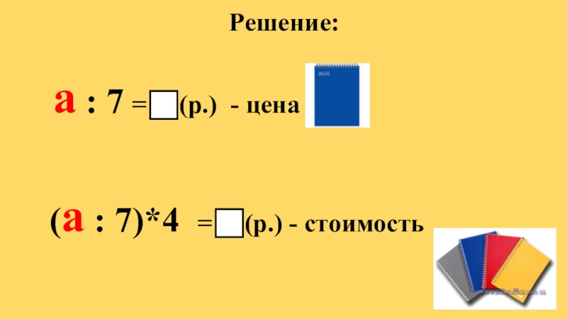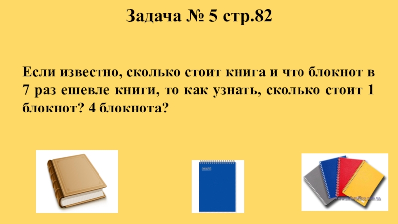 в 7 раз ешевле книги, то как узнать, сколько стоит 1 блокнот? 4 блокнота?