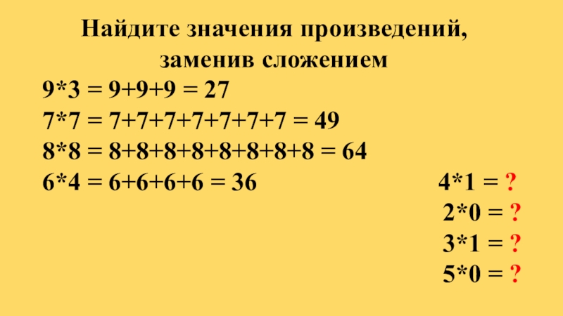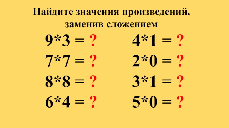 закрепить умение заменять произведение чисел суммой и наоборот, вычислять их значение; формировать навыки работы с тестом задач.