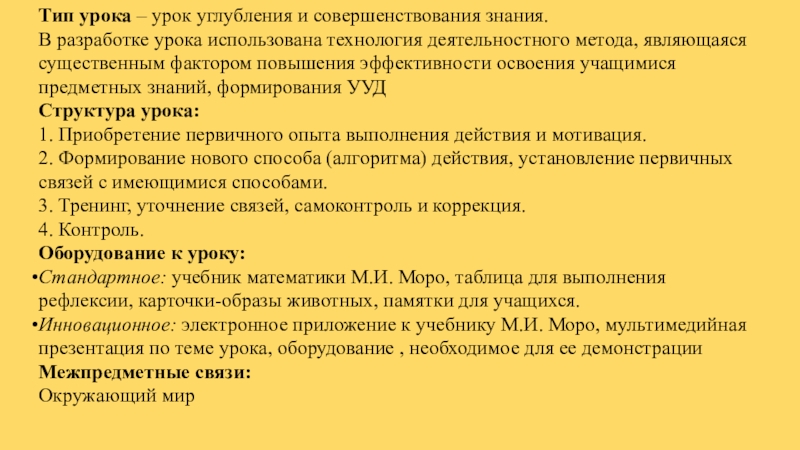Инновационное: электронное приложение к учебнику М.И. Моро, мультимедийная презентация по теме урока, оборудование , необходимое для ее демонстрации