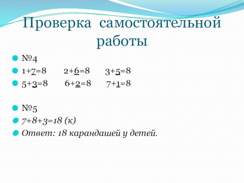 Проверка самостоятельной работы№41+7=8    2+6=8    3+5=85+3=8    6+2=8