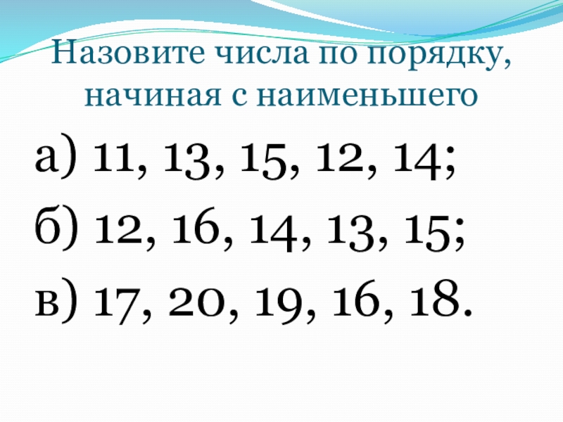 Назовите числа по порядку, начиная с наименьшегоа) 11, 13, 15, 12, 14;б) 12, 16, 14, 13, 15;в)