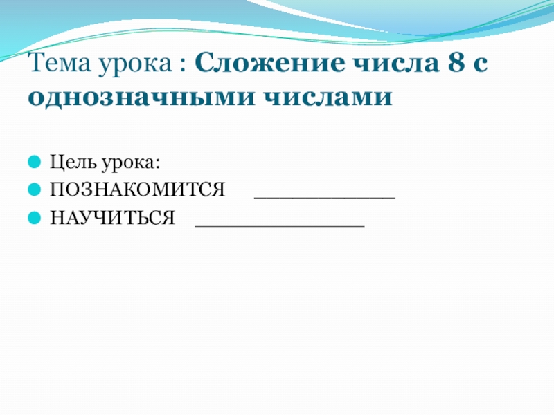 Тема урока : Сложение числа 8 с однозначными числамиЦель урока:ПОЗНАКОМИТСЯ   ___________НАУЧИТЬСЯ  _________________