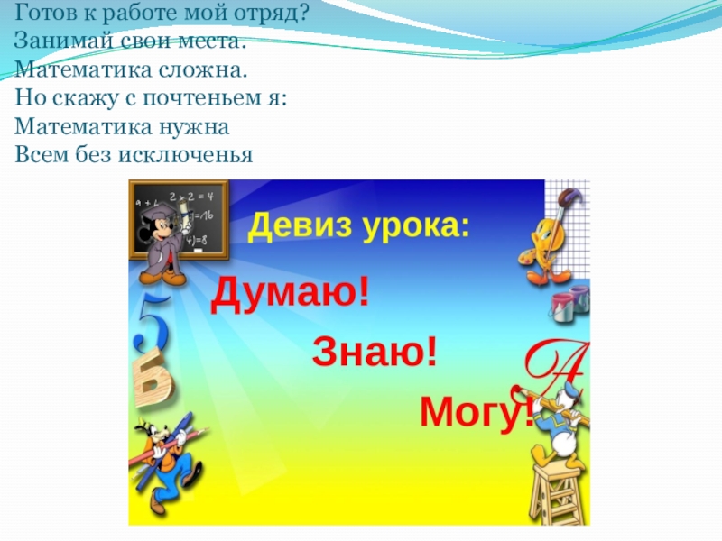 А ну-ка, дети, встаньте в ряд! Готов к работе мой отряд? Занимай свои места. Математика сложна. Но