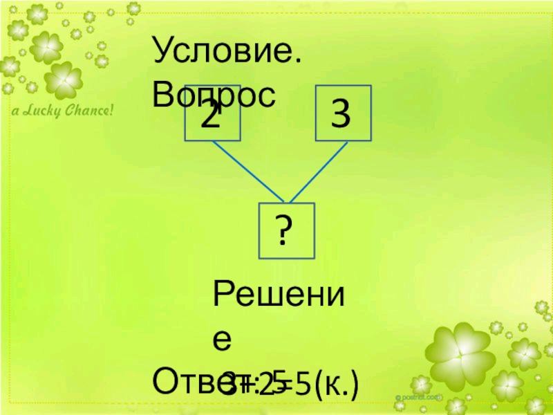 23?Условие. ВопросРешение 3+2=5(к.)Ответ: 5 котиков.