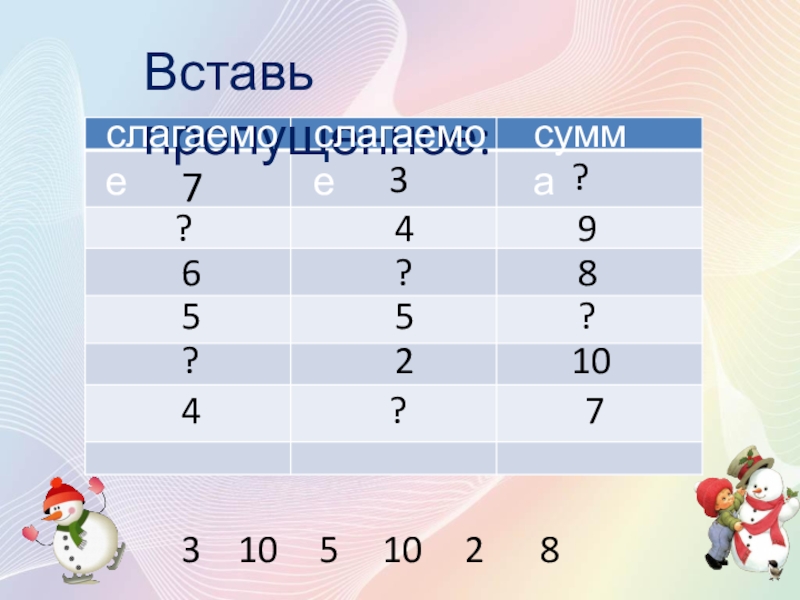 Вставь пропущенное:слагаемоеслагаемоесумма7??496?855??2104?710521038