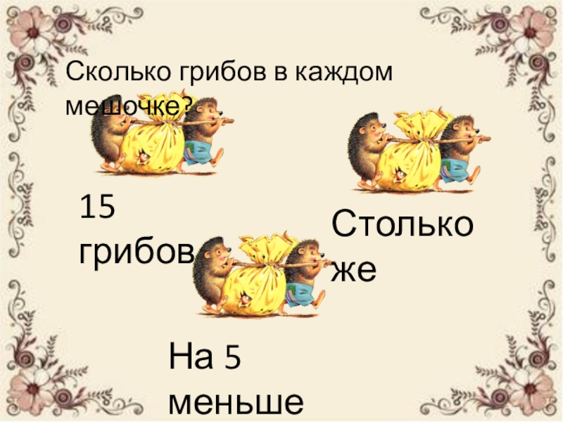 Сколько грибов в каждом мешочке?15 грибовСтолько жеНа 5 меньше