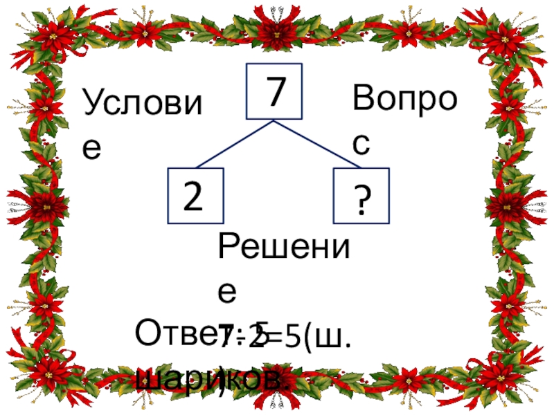 72?УсловиеВопросРешение7-2=5(ш.)Ответ: 5 шариков.