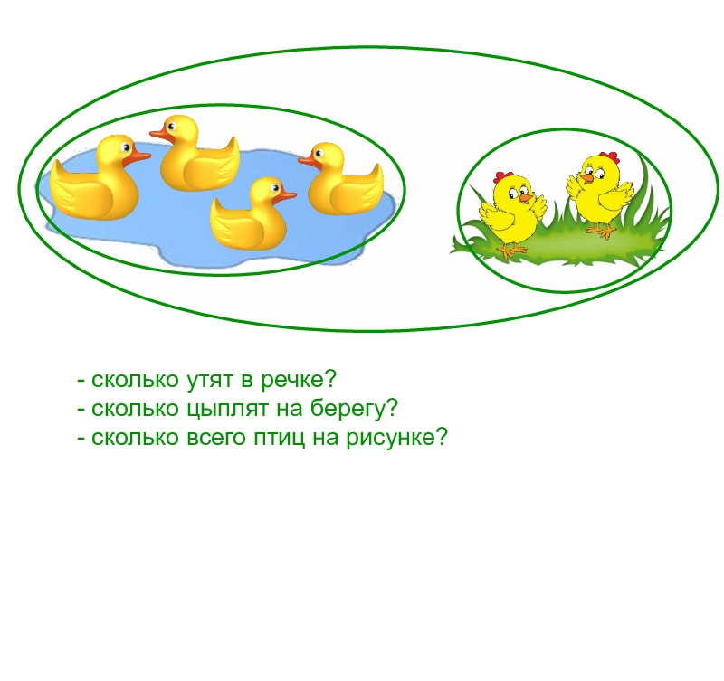 - сколько утят в речке?- сколько цыплят на берегу?- сколько всего птиц на рисунке?