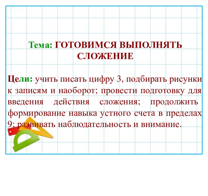 Тема: ГОТОВИМСЯ ВЫПОЛНЯТЬ СЛОЖЕНИЕЦели: учить писать цифру 3, подбирать рисунки к записям и наоборот; провести подготовку для