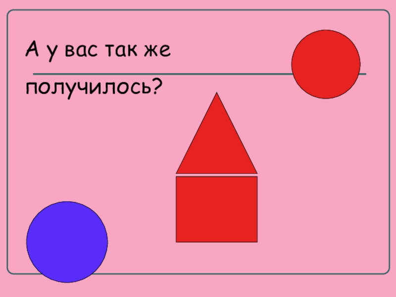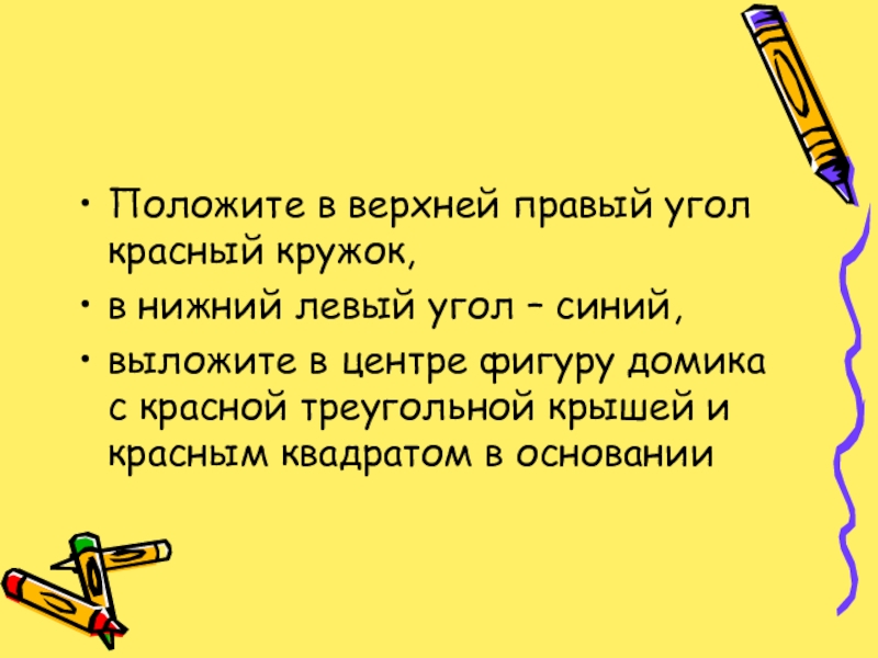 Положите в верхней правый угол красный кружок, в нижний левый угол – синий, выложите в центре фигуру