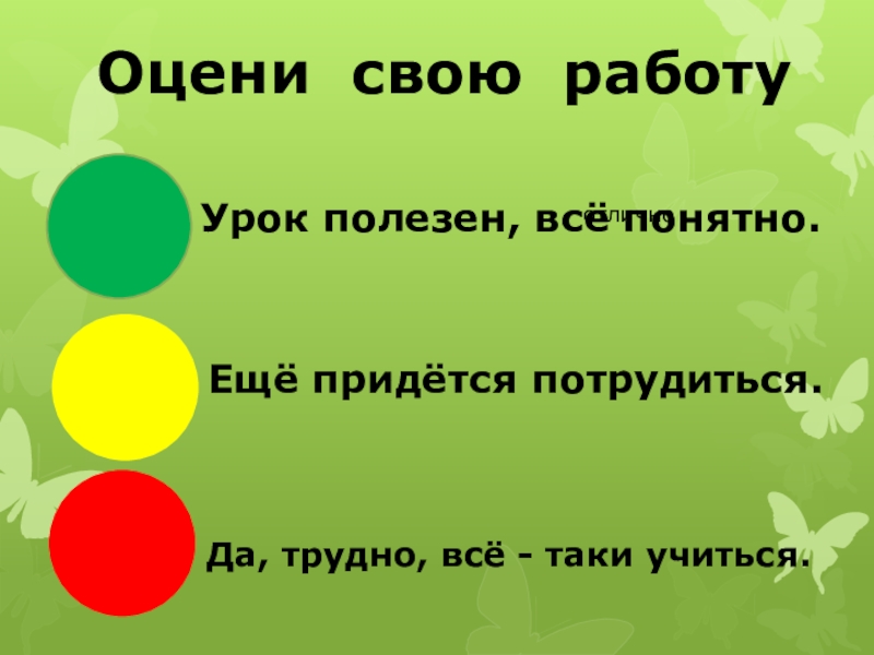 Оцени свою работу отличноУрок полезен, всё понятно.Ещё придётся потрудиться.  Да, трудно, всё - таки учиться.