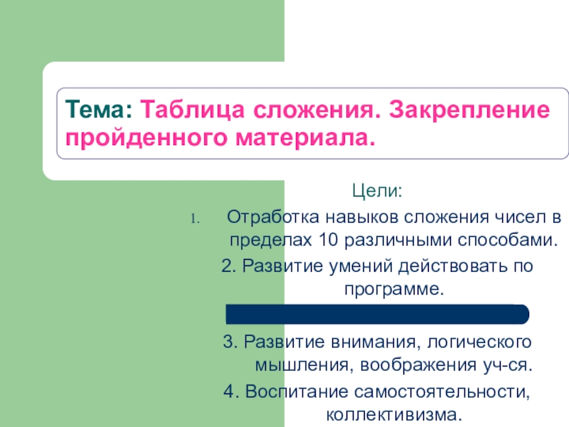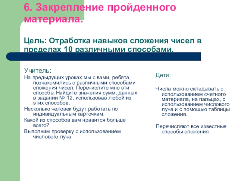 Числа можно складывать с использованием счетного материала, на пальцах, с использованием числового луча и с помощью таблицы сложения.