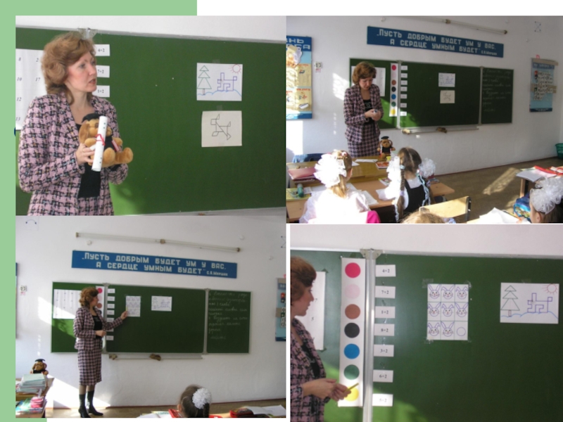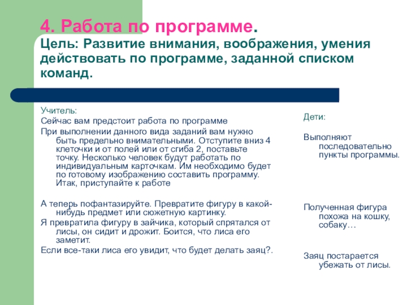 При выполнении данного вида заданий вам нужно быть предельно внимательными. Отступите вниз 4 клеточки и от полей или от сгиба 2, поставьте точку. Несколько человек будут работать по индивидуальным карточкам. Им необходимо будет по готовому изображению составить программу. Итак, приступайте к работе