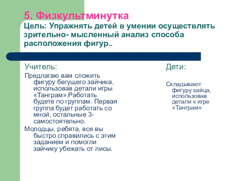 Предлагаю вам сложить фигуру бегущего зайчика, использовав детали игры «Танграм».Работать будете по группам. Первая группа будет работать со мной, остальные 3- самостоятельно.