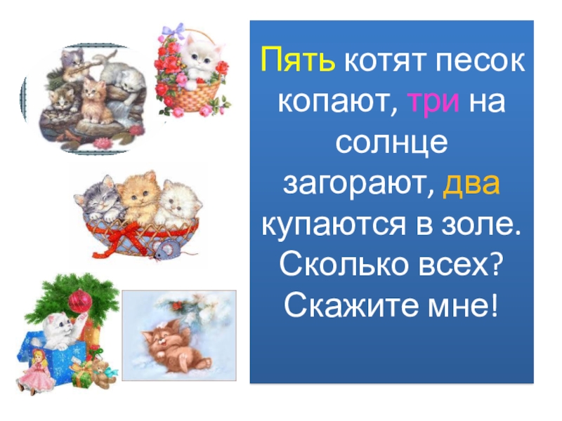 Пять котят песок копают, три на солнце загорают, два купаются в золе. Сколько всех? Скажите мне!
