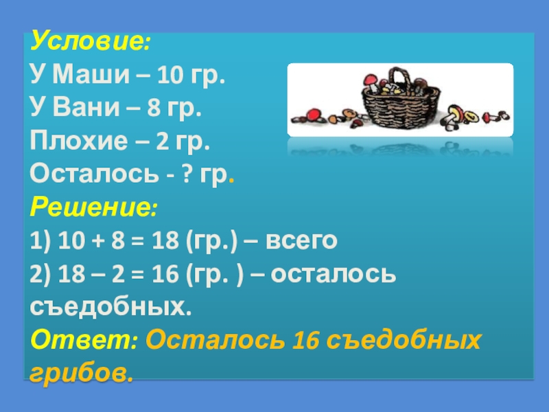 У Маши – 10 гр. У Вани – 8 гр. Плохие – 2 гр. Осталось - ? гр. Решение: 1) 10 + 8 = 18 (гр.) – всего 2) 18 – 2 = 16 (гр. ) – осталось съедобных. Ответ: Осталось 16 съедобных грибов.