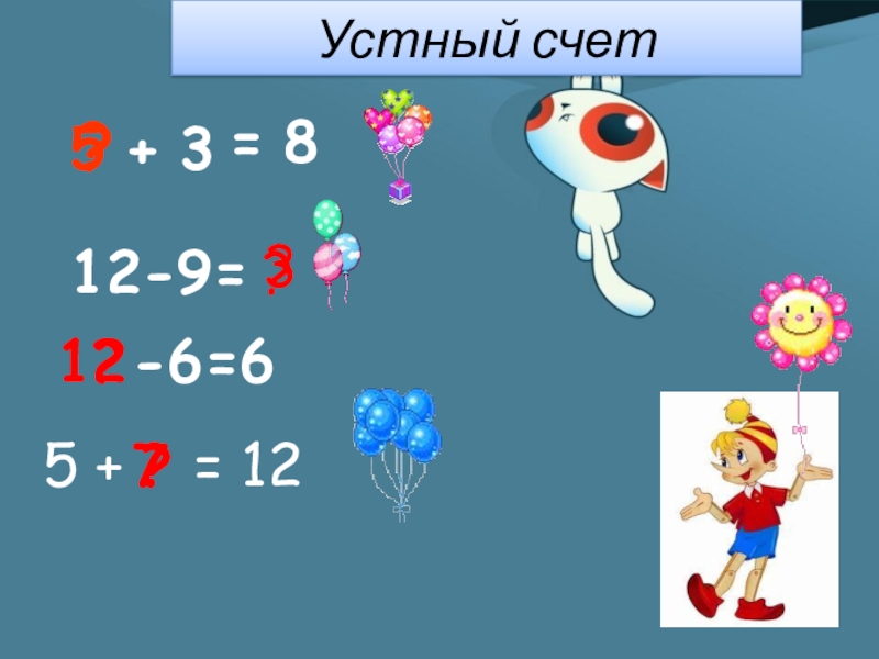 Устный счет5?+8=312-9=3?-6=6?125 +  = 12?7