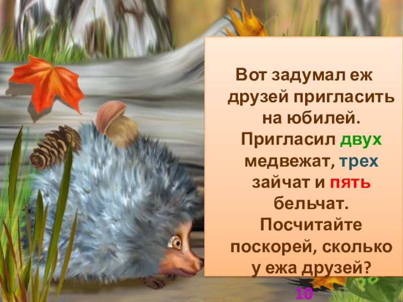 Задачи-шутки (устно).Вот задумал еж друзей пригласить на юбилей. Пригласил двух медвежат, трех зайчат и пять бельчат. Посчитайте