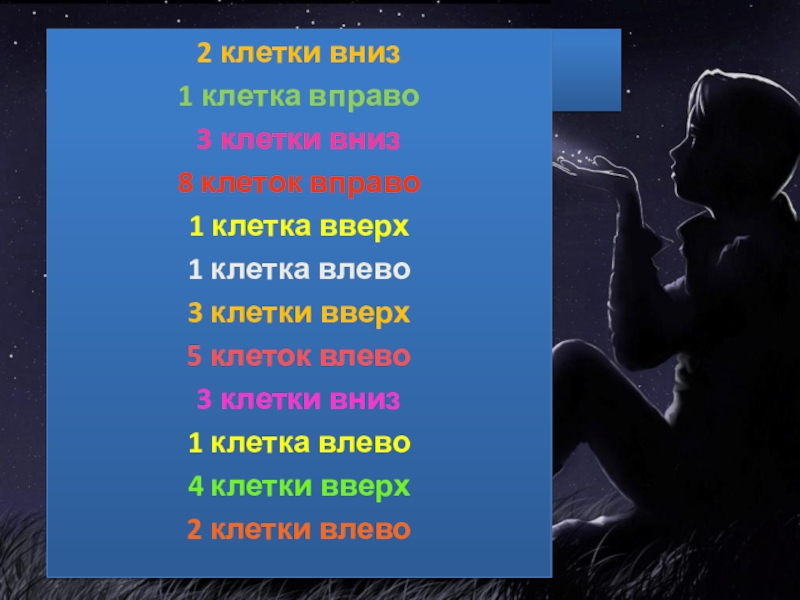 Графический диктант2 клетки вниз1 клетка вправо3 клетки вниз8 клеток вправо1 клетка вверх1 клетка влево3 клетки вверх5 клеток влево3 клетки вниз1 клетка влево4 клетки вверх2 клетки влево