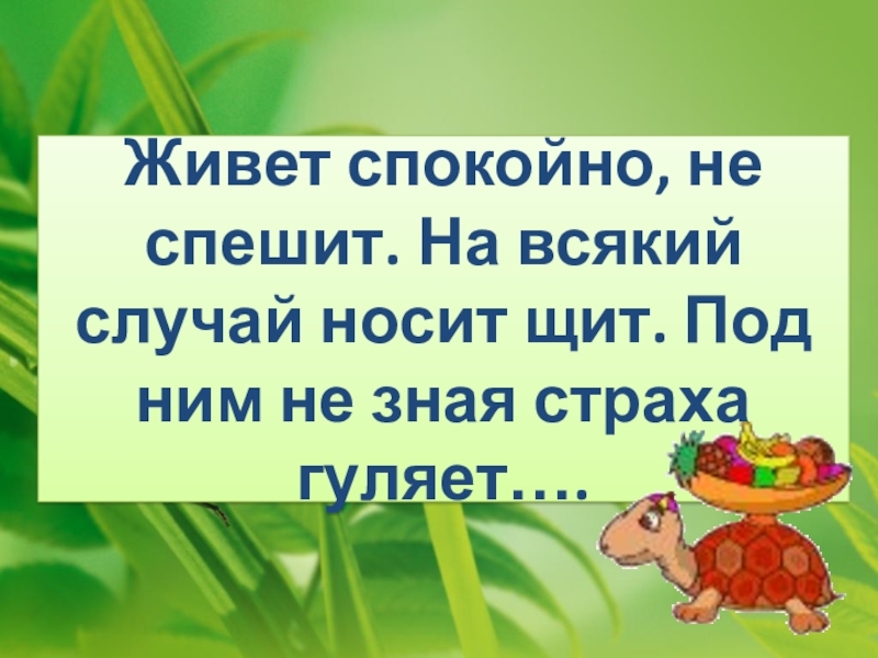 Слайд 3Живет спокойно, не спешит. На всякий случай носит щит. Под ним