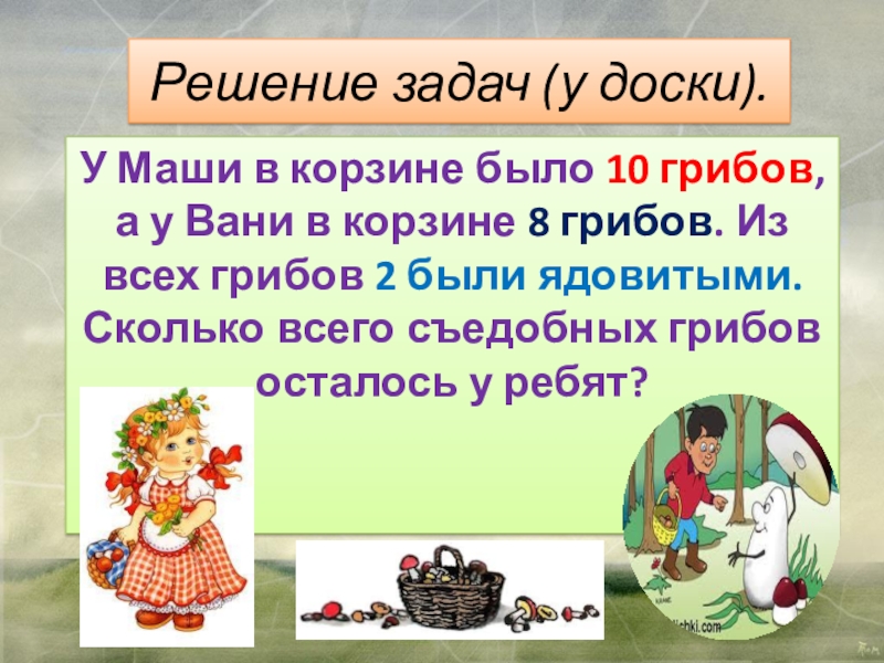 Решение задач (у доски).У Маши в корзине было 10 грибов, а у Вани в корзине 8 грибов.