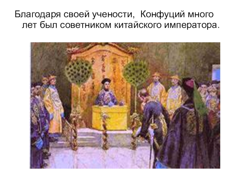 Слайд 7Благодаря своей учености, Конфуций много лет был советником китайского императора.