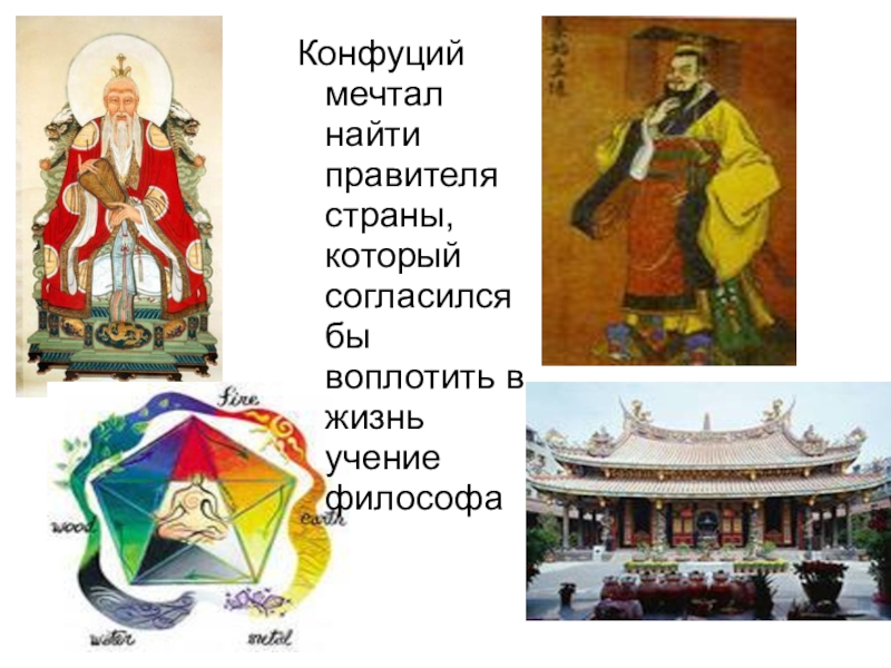 Слайд 10Конфуций мечтал найти правителя страны, который согласился бы воплотить в жизнь