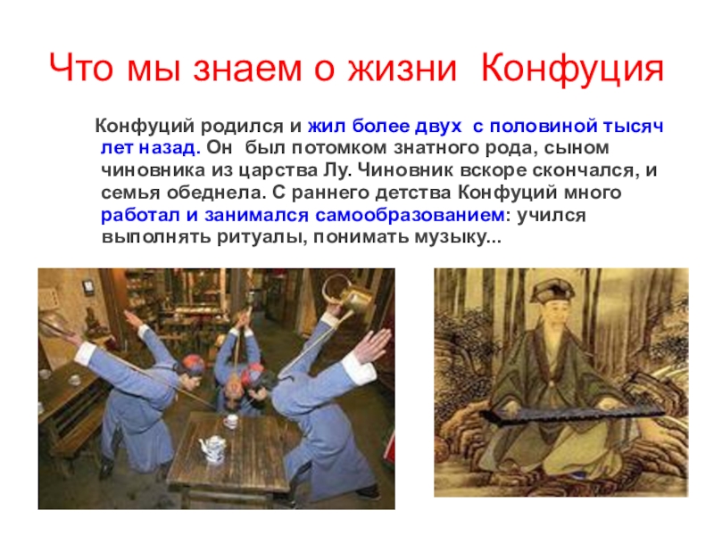 и жил более двух с половиной тысяч лет назад. Он был потомком знатного рода, сыном чиновника из царства Лу. Чиновник вскоре скончался, и семья обеднела. С раннего детства Конфуций много работал и занимался самообразованием: учился выполнять ритуалы, понимать музыку...