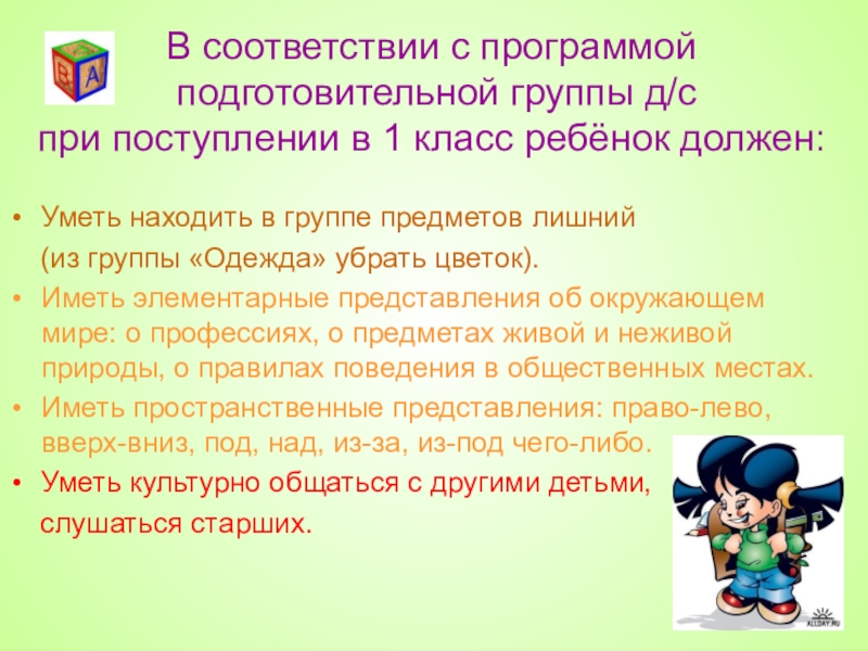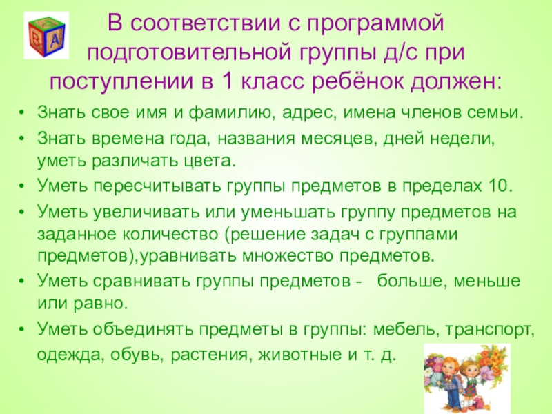 В соответствии с программой подготовительной группы д/с при поступлении в 1 класс ребёнок должен: