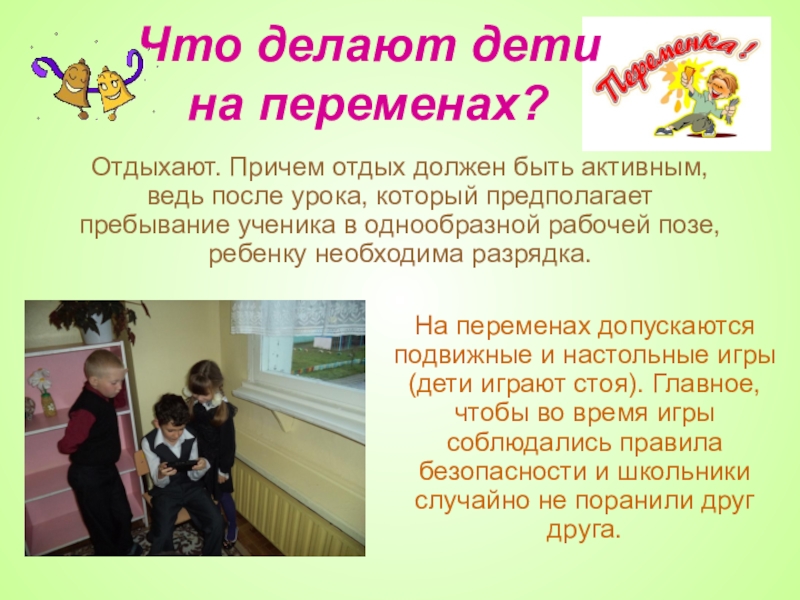 Отдыхают. Причем отдых должен быть активным, ведь после урока, который предполагает пребывание ученика в однообразной рабочей позе, ребенку необходима разрядка.