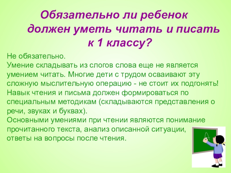 Умение складывать из слогов слова еще не является умением читать. Многие дети с трудом осваивают эту сложную мыслительную операцию - не стоит их подгонять! Навык чтения и письма должен формироваться по специальным методикам (складываются представления о речи, звуках и буквах).