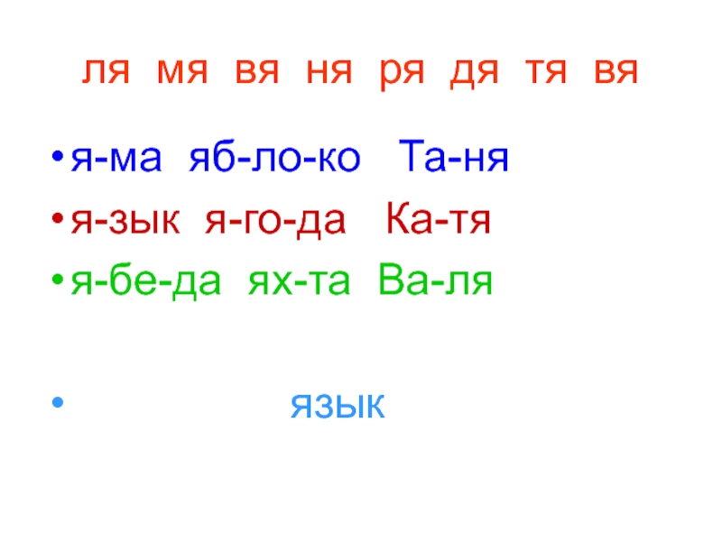 ля мя вя ня ря дя тя вяя-ма яб-ло-ко  Та-няя-зык я-го-да  Ка-тяя-бе-да ях-та Ва-ля