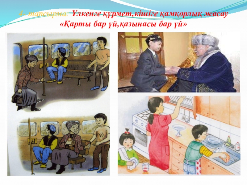 4- тапсырма: Үлкенге құрмет,кішіге қамқорлық жасау «Қарты бар үй,қазынасы бар үй»