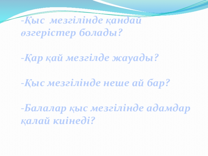 -Қыс мезгілінде қандай өзгерістер болады?-Қар қай мезгілде жауады?-Қыс мезгілінде неше ай бар?-Балалар қыс мезгілінде адамдар қалай киінеді?
