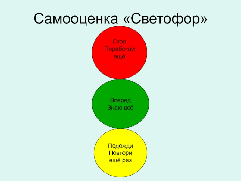 Самооценка «Светофор»ВпередЗнаю всёСтопПоработай ещёПодождиПовтори ещё раз