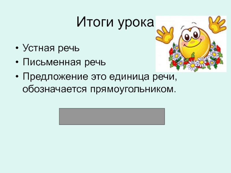 Итоги урокаУстная речьПисьменная речьПредложение это единица речи, обозначается прямоугольником.