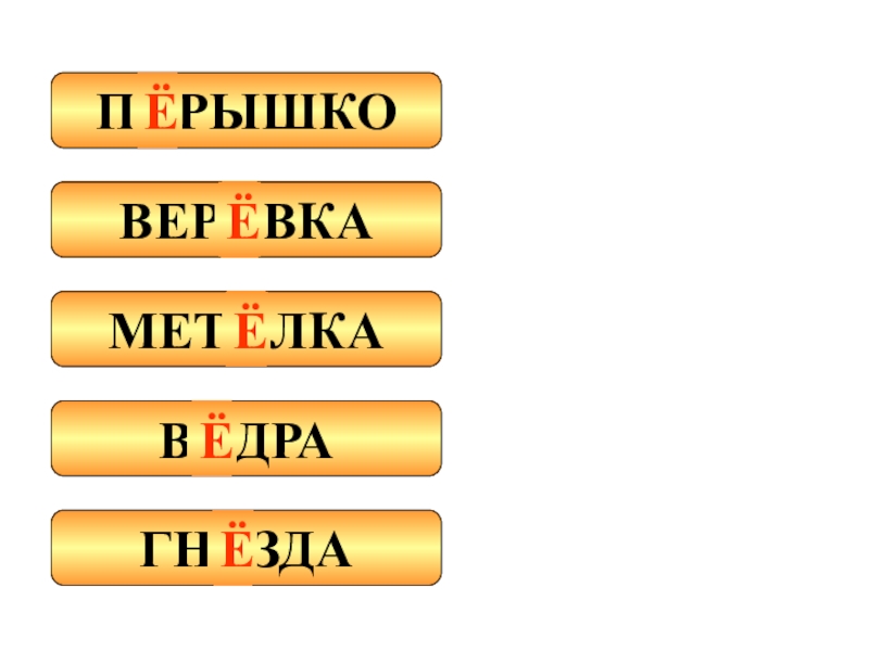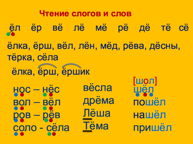 ёлка, ёрш, вёл, лён, мёд, рёва, дёсны, тёрка, сёла