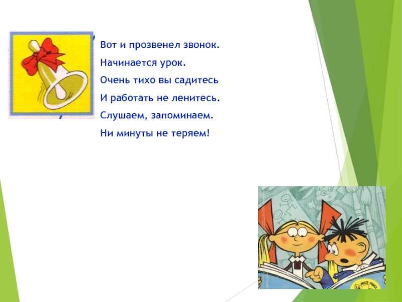 Вот и прозвенел звонок.Начинается урок.Очень тихо вы садитесьИ работать не ленитесь.Слушаем, запоминаем.Ни минуты не теряем!