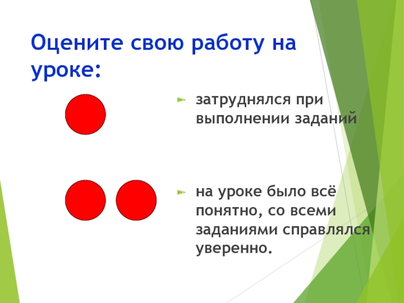 Оцените свою работу на уроке:затруднялся при выполнении заданийна уроке было всё понятно, со всеми заданиями справлялся уверенно.