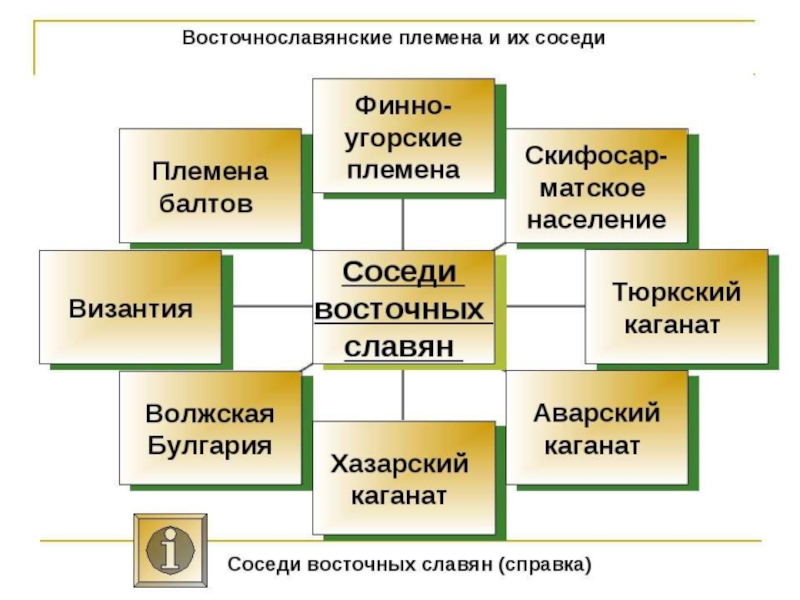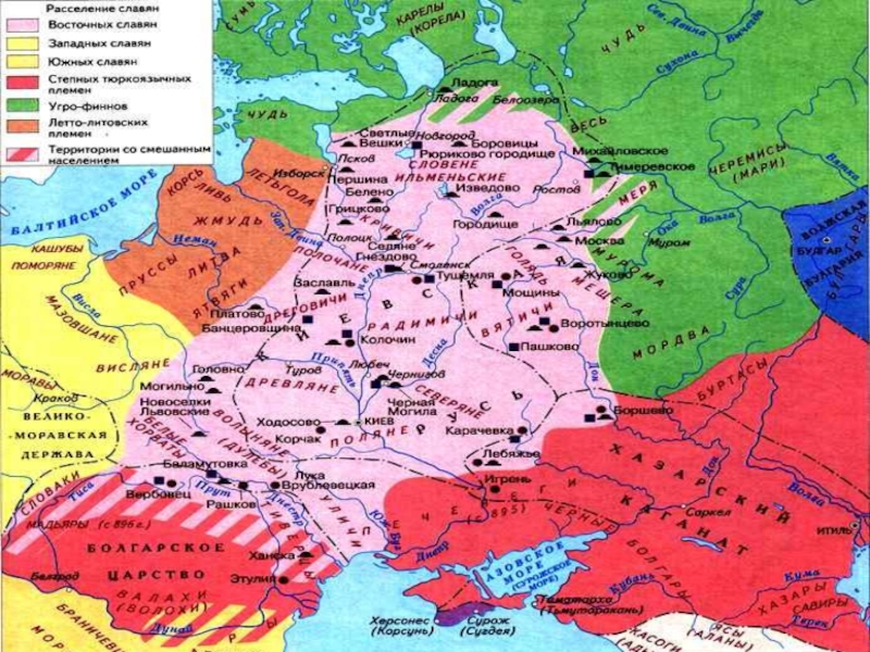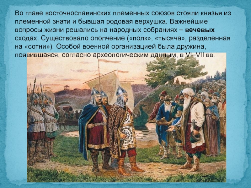 бывшая родовая верхушка. Важнейшие вопросы жизни решались на народных собраниях – вечевых сходах. Существовало ополчение («полк», «тысяча», разделенная на «сотни»). Особой военной организацией была дружина, появившаяся, согласно археологическим данным, в VI–VII вв.